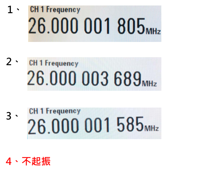 我們拿到客戶寄回來(lái)的4PCS不良品,晶體單個(gè)頻率測(cè)試如下,三片7L26002009晶振起振,其中一片不起振。