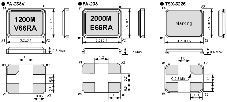 1,F(xiàn)A-238晶振,體積3.2*2.5*0.7mm。頻率范圍16-60MHZ。長度兩腳間距1.2mm,寬度兩腳間距0.7mm。四腳均無斜角變化。腳位方向從貼片晶振正面左下方逆時(shí)針順序分別為1,2,3,4.
