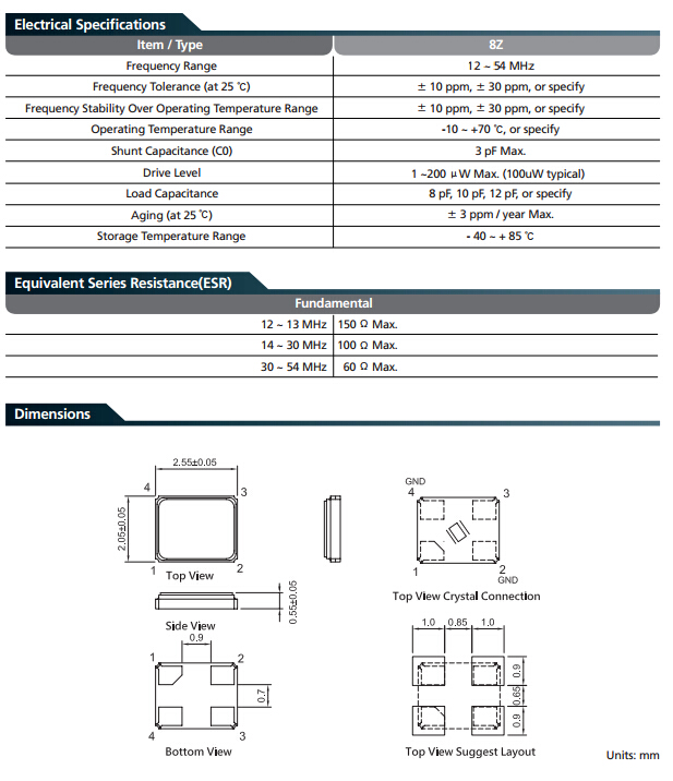 - 晶振外部尺寸:7.0x5.0x1.3mm
