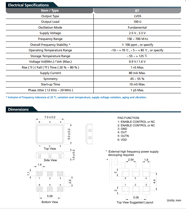 - 晶振外部尺寸:7.0x5.0x1.3mm